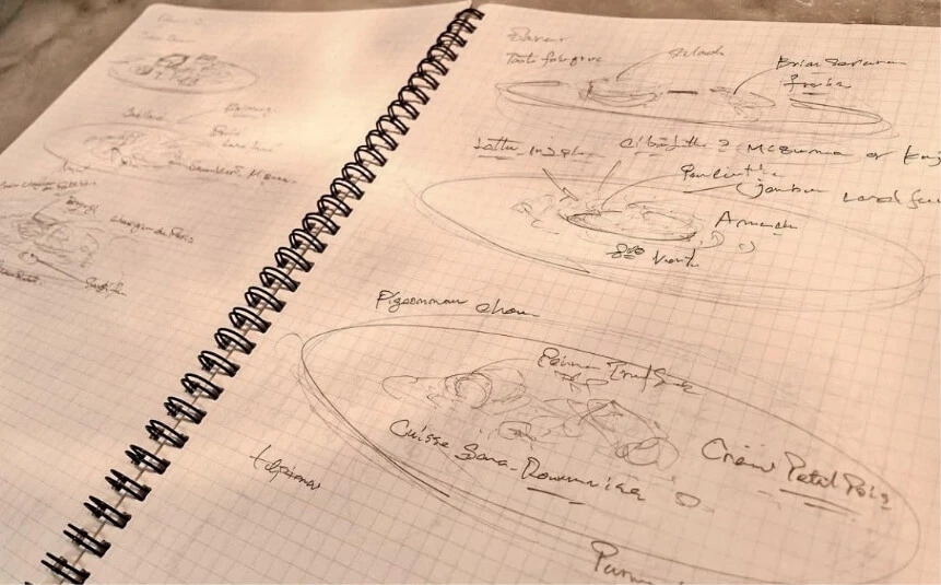 「侘び寂び」日本・フランスの美意識のもとに季節の美味しい香り、色とりどりの野菜や美しい盛り付け、目でも楽しめる料理を心掛けています。